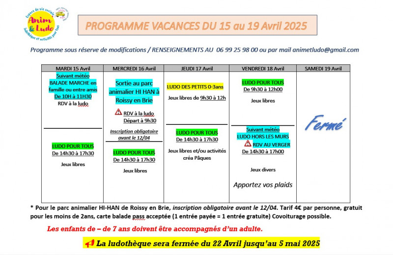 Quelques images des activités proposées pendant les vacances d'Avril (1ère semaine) : sortie au parc animalier HI HAN de Roissy en Brie, atelier créatif sur le thème de Pâques et jeux extérieurs dans le jardin.